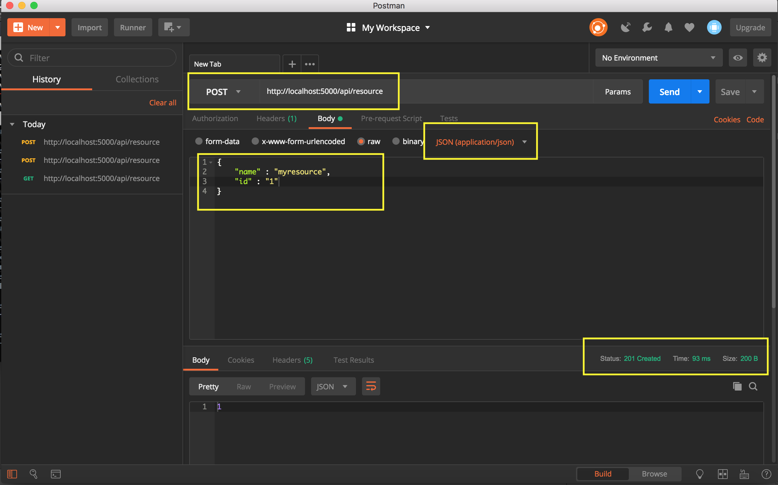 We can then test the implementation with Postman like so (yellow boxes indicate changes and results on send)