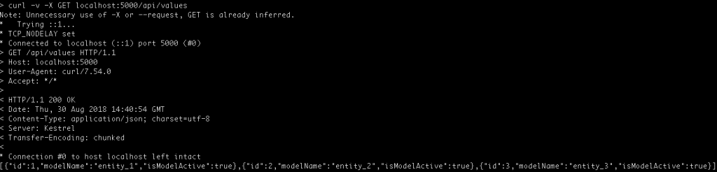 I ran into this scenario when I was creating some automated integration testing for a build pipeline, where the web api should be set up for each test as close to the production system as possible. The tests then where run with a bash script, that send off some requests via curl to the actual application and checked for the expected status codes. (I will include a sample script that can be viewed in the github page and at the end of this post, but without the status code checking. For that see my post on test your web api)