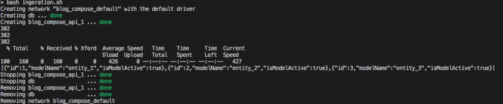 For each full test run, the container of the application and the database where build from an image and run as a container. Then when the script had run all requests, the containers where stopped and disposed. This is the blueprint for this post, because it is a quite common scenario for integration testing in a contionous integration/delivery environment IMHO.