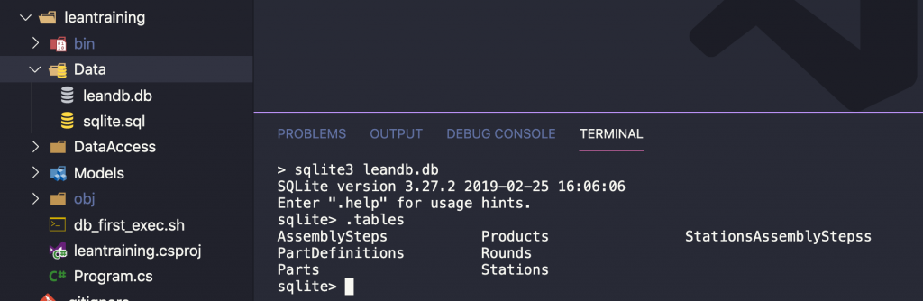Im Terminal kann man die vorhandenen Tabellen sehen (unter .tables)