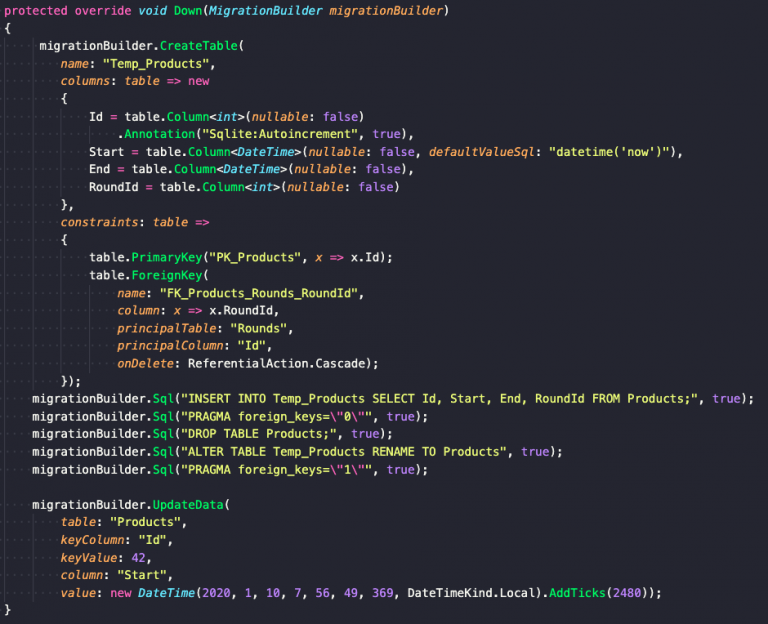 protected override void Down(MigrationBuilder migrationBuilder) { migrationBuilder.CreateTable( name: "Temp_Products", columns: table => new { Id = table.Column<int>(nullable: false) .Annotation("Sqlite:Autoincrement", true), Start = table.Column<DateTime>(nullable: false, defaultValueSql: "datetime('now')"), End = table.Column<DateTime>(nullable: false), RoundId = table.Column<int>(nullable: false) }, constraints: table => { table.PrimaryKey("PK_Products", x => x.Id); table.ForeignKey( name: "FK_Products_Rounds_RoundId", column: x => x.RoundId, principalTable: "Rounds", principalColumn: "Id", onDelete: ReferentialAction.Cascade); }); migrationBuilder.Sql("INSERT INTO Temp_Products SELECT Id, Start, End, RoundId FROM Products;", true); migrationBuilder.Sql("PRAGMA foreign_keys=\"0\"", true); migrationBuilder.Sql("DROP TABLE Products;", true); migrationBuilder.Sql("ALTER TABLE Temp_Products RENAME TO Products", true); migrationBuilder.Sql("PRAGMA foreign_keys=\"1\"", true); }