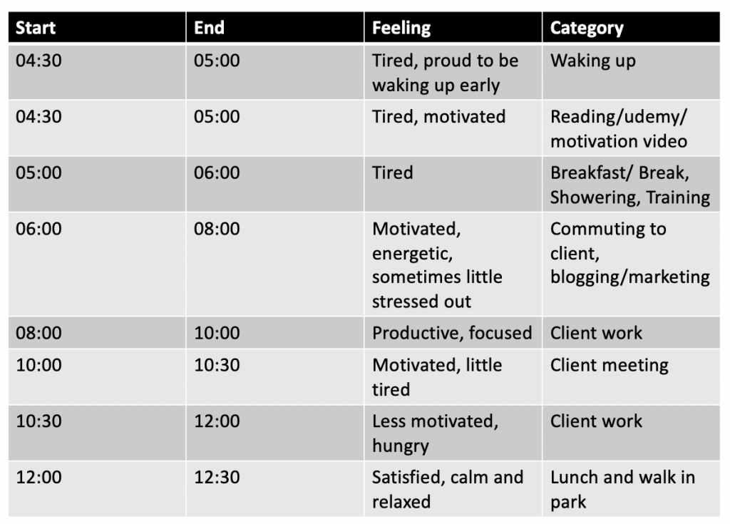 Also when we look at the column of how I felt during the day we can see, that my hours with the most focus are from 6 to around 11 in the morning.