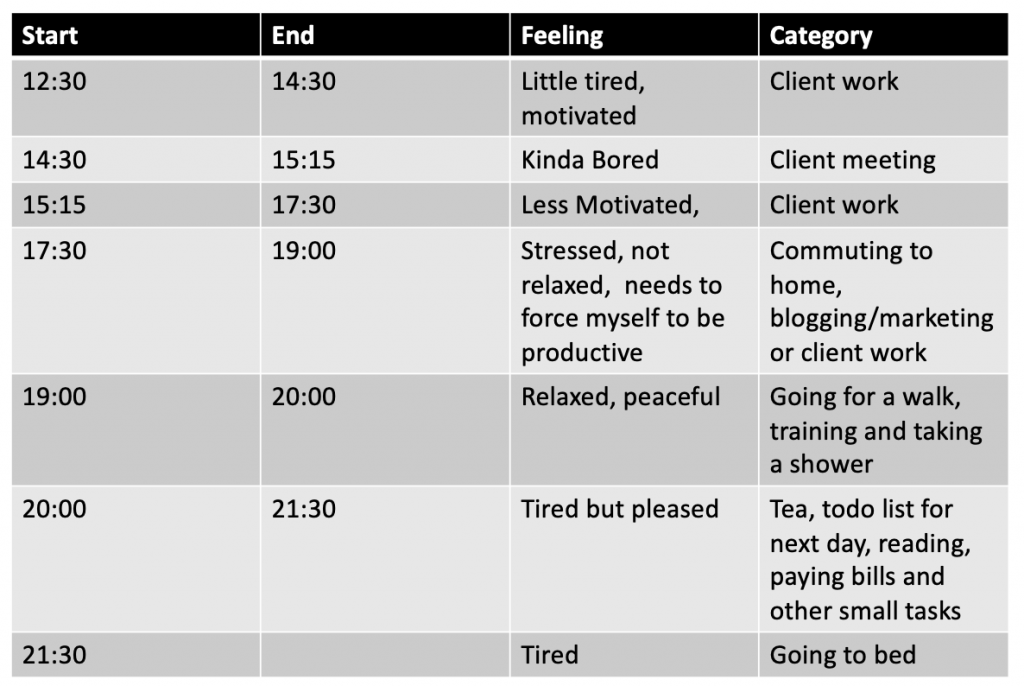 This should be done in a way that you not only track the time spent, but also the category of the activity and how you did feel during this period.